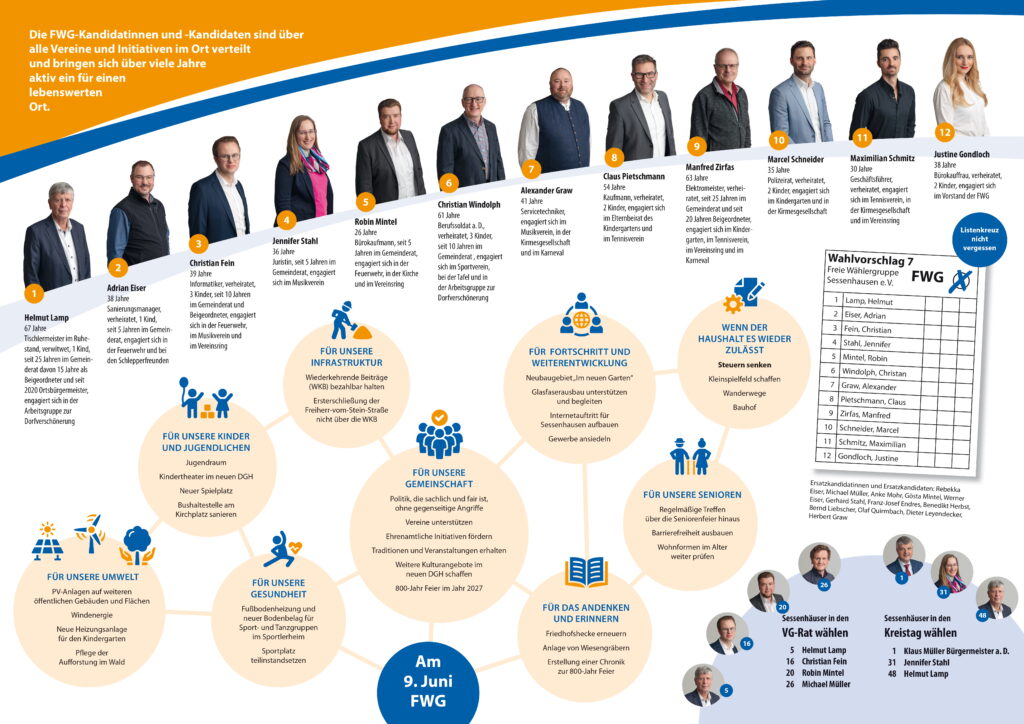 In den letzten fünf Jahren konnten wir viel für unsere Gemeinde bewegen. Mit klaren Zielen vor Augen haben wir konkrete Maßnahmen ergriffen und erfolgreich umgesetzt. Nun stehen wir bereit, auch in der kommenden Wahlperiode unser Engagement fortzusetzen und Sessenhausen weiterhin positiv mitzugestalten.